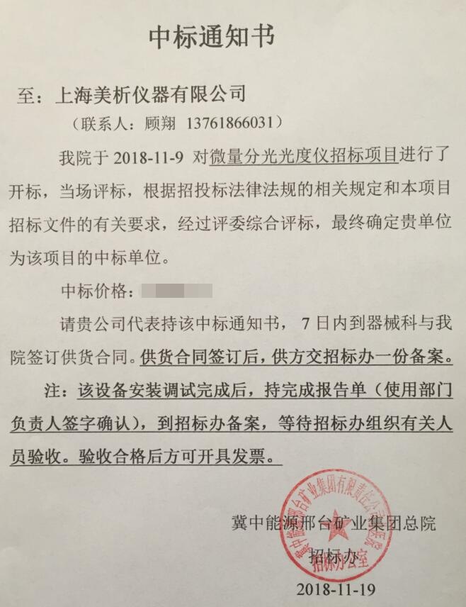 喜報(bào)!恭賀我司中標(biāo)由冀中能源邢臺(tái)礦業(yè)集團(tuán)總醫(yī)院招標(biāo)辦組織的“微量分光光度儀”采購(gòu)項(xiàng)目于2018年11月9日、10日正式公開(kāi)招標(biāo)。我公司有幸參與此次投標(biāo)活動(dòng),經(jīng)全體員工共同努力,美析儀器以嚴(yán)謹(jǐn)?shù)膽B(tài)度出色完成了標(biāo)書(shū)制作,并始終堅(jiān)持為我們的客戶(hù)提供國(guó)內(nèi)外最優(yōu)質(zhì)產(chǎn)品的誠(chéng)信經(jīng)營(yíng)之道,最終得到了評(píng)選委員會(huì)的認(rèn)可。評(píng)標(biāo)委員會(huì)秉持公平公正的原則,經(jīng)慎重考慮、嚴(yán)格篩選,在眾投標(biāo)單位中選擇了上海美析儀器有限公司。