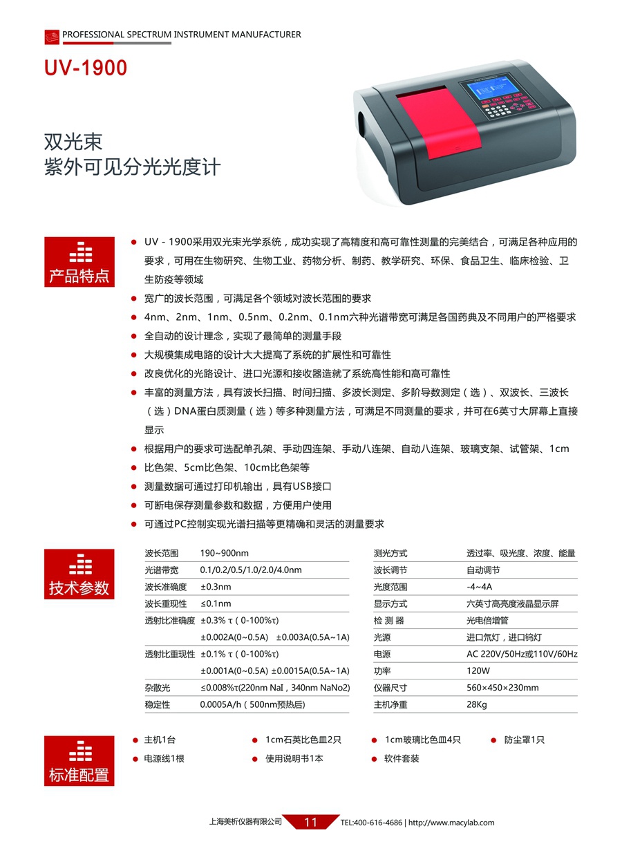 使用上海美析 UV-1900的紫外可見分光光度計,可完美測量樣品從190-900nm波長范圍的紫外-可見光透過率結果,其波長準確度高達0.3nm,透射比準確度高達0.002A,透射比重現(xiàn)性高達0.001A!