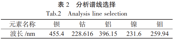 電感耦合等離子體發(fā)射光譜法雖然專屬性較 好,但待測元素在同位素或其他元素共存時,選擇適 合的分析譜線可以有效提高檢測靈敏度和準確度。 如鉛元素常選用 220.353nm 作為分析譜線,但如果 有鐵基質存在時,會對鉛的檢測造成干擾,因此選擇 220.353nm 作為分析譜線就不合適。實驗通過對加 標樣品溶液進行檢測,參考相關文獻最終確定鋇、 鈷、鋁、鎳、鉬的最佳分析譜線見表 2。