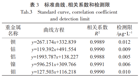 取 1.4.1 標準儲備溶液,分別精密量取適量,分 別置 6 個 10mL 棕色量瓶中,制備每 1.0mL 溶液中 含有 4 種待 測 金 屬 元 素 依 次 為 0.02、0.05、0.2、0.4、 0.6、1.0、4.0μg·L-1 的標準曲線溶液,加 HNO3(5.0%) 稀釋至刻度,搖勻;再按 1.3 儀器條件設置儀器,分 別將上述標準曲線溶液注入儀器,以橫坐標為重金 屬濃度(X)、縱坐標為響應值(Y)進行線性回歸,計 算曲線方程,在以 3 倍信號值和噪音值比值作為檢 測限;結果 5 種待測重金屬線性關系良好,相關系數(shù) 均大于 0.995,檢測限在 0.005~0.012μg·L-1 之間。結 果見表 3。