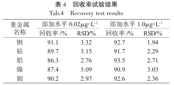 隨機取地表水(湖泊、溪流)樣品 1000mL,共取 6 份,分別精密加入 1.4.1 標準儲備溶液適量,后續(xù) 按 1.4.2 樣品溶液方法進行前處理,制備含鋇、鈷、 鋁、鎳、鉬分別為 0.02 和 1.0μg·L-1 的加標溶液;再 按 1.3 儀器條件設置儀器,分別將上述加標溶液注 入儀器,以樣品檢測值和加入量計算回收率;結果 5 種 待 測 金 屬 2 水 平 加 標 回 收 率 在 86.3% ~93.5% 之 間,符合要求。結果見表 4。