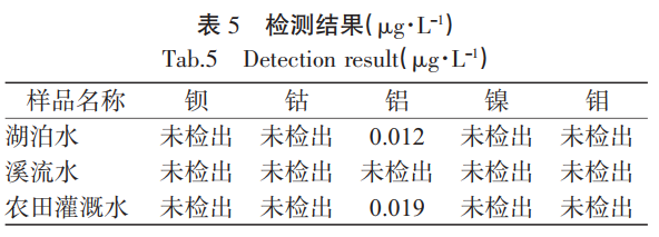 隨機取地表水樣品 1000 mL(湖泊、溪流、農田灌溉),分別按 1.4.2 樣品溶液方法進行前處理,每個 樣品平行制備 2 份樣品溶液,再按 1.3 儀器條件設 置儀器,分別將上述溶液注入儀器,計算地表水樣品 中鋇、鈷、鋁、鎳、鉬的含量。在湖泊水和農田灌溉水 中檢出微量鋁殘留,結果見表 5。
