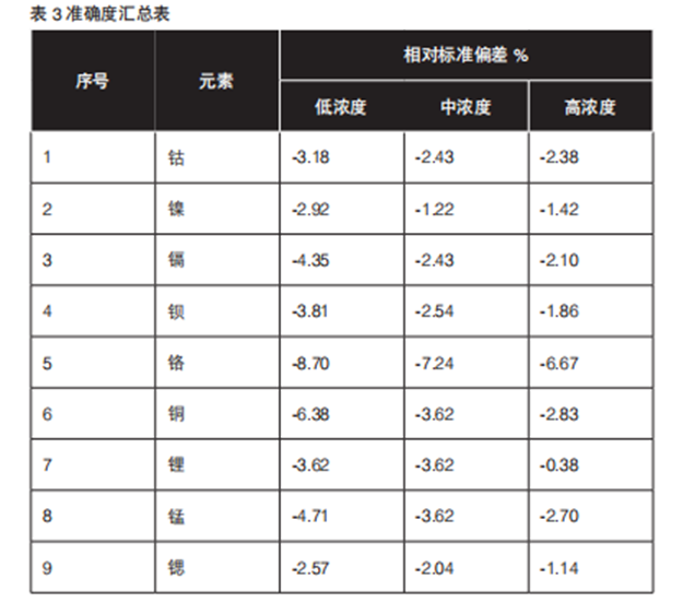 Accuracy is often used to measure the degree of agreement between the analysis results (the mean value of single measurement or repeated measurement) obtained by a specific analysis program and the assumed or recognized true value. The accuracy of an analysis method or analysis system is the comprehensive index of systematic error and random error existing in the method or measurement system, which determines the reliability of the analysis results. This paper tests the accuracy of cobalt, nickel, cadmium, barium, chromium, copper, lithium, manganese and strontium with three concentration solutions. The results are shown in Table 3. The relative deviation ranges from - 8.70% to - 0.38%. In the range of quality control values, there are many elements with low accuracy, and the accuracy of chromium is relatively low, which is preliminarily estimated to be caused by large interference.