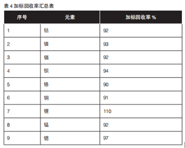Standard addition recovery is another indicator of test accuracy. A certain amount of standard sample was added into the actual sample to calculate the recovery. The recoveries of cobalt, nickel, cadmium, barium, chromium, copper, lithium, manganese and strontium ranged from 90% to 110%, as shown in Table 4. It shows that the random error and systematic error are small, and the whole analysis process is stable and reliable.