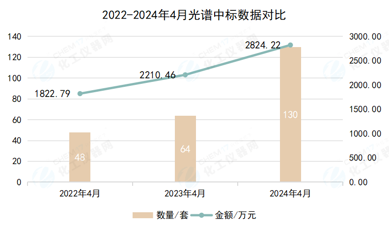 近日,化工儀器網編輯對2024年4月中國政府采購網上的光譜儀/光度計的中標項目進行了整理。據化工儀器網不完全統計,4月中國政府采購網可統計到的光譜儀中標數量為130套,中標金額為2824.22萬元,平均單價為21.72萬元/套。