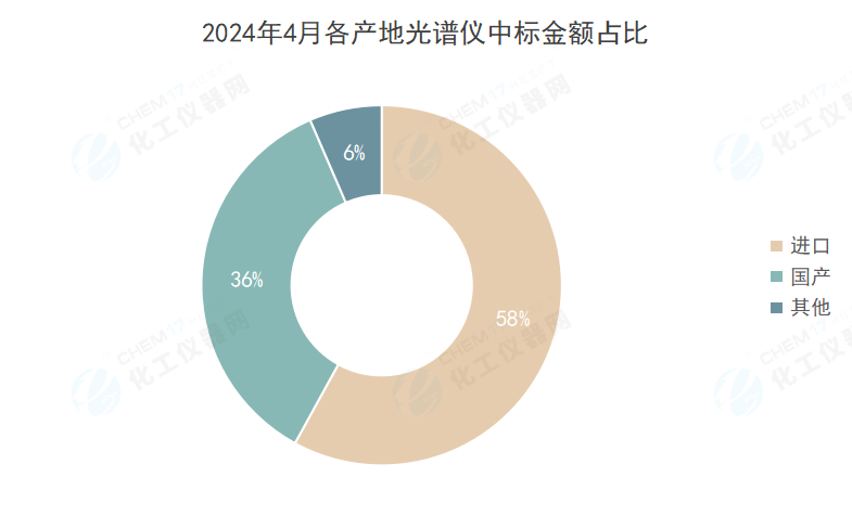 從“各產地光譜儀中標金額占比”數據來看,4月進口品牌光譜儀的中標金額為1637.68萬元,約占4月中標金額的58%;國產品牌光譜儀中標金額為1003.25萬元,約占4月中標金額的36%。