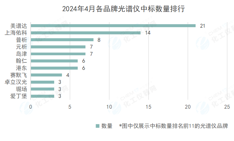 從各品牌光譜儀的中標數量上看,4月光譜儀中標數量排名前6的品牌分別是美譜達、上海佑科、普析、元析、島津,中標數量分別21套、14套、8套、7套、7套。國產品牌在中標數量上有明顯優(yōu)勢。