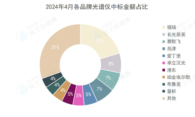“2024年4月各品牌光譜儀中標金額占比”中僅詳細展示了中標金額排名前10的品牌,其余歸為其他品牌。