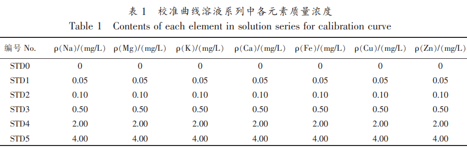 鈉、鎂、鉀、鈣、鐵、銅、鋅標準溶液:濃度1000mg/L,guo家標準物質(zhì)研究zhong心提供。