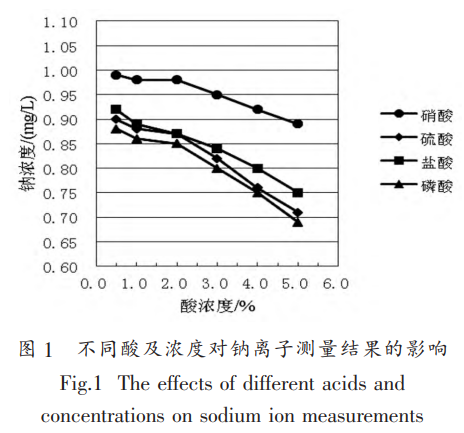 不同酸及濃度對鈉離子測量結(jié)果的影響見圖1。不論使用哪種酸,當酸度增大時,都會產(chǎn)生負的干擾,在硝酸、硫酸、鹽酸、磷酸等幾種常見無機酸中,硝酸對鈉的干擾相對較小,其它酸的背景吸收都較大。因此,本方法選擇用硝酸溶解試樣。結(jié)果也表明,硝酸的用量對測定結(jié)果有影響,硝酸濃度增加時,鈉含量的測定值下降,在硝酸體積分數(shù)≤2%時下降幅度不ming顯??紤]到?jīng)_分溶解、靈敏度和對儀器的保護,方法選用體積分數(shù)為2%的硝酸。