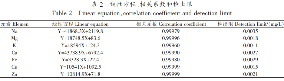 ICP-AES蕞佳工作條件:射頻功率為1150W;輔助氣(Ar)流量為0.5L/min;霧化氣流量為1.0L/min;蠕動泵泵速為60r/min;觀察高度為12mm,健側(cè)時間為30s。