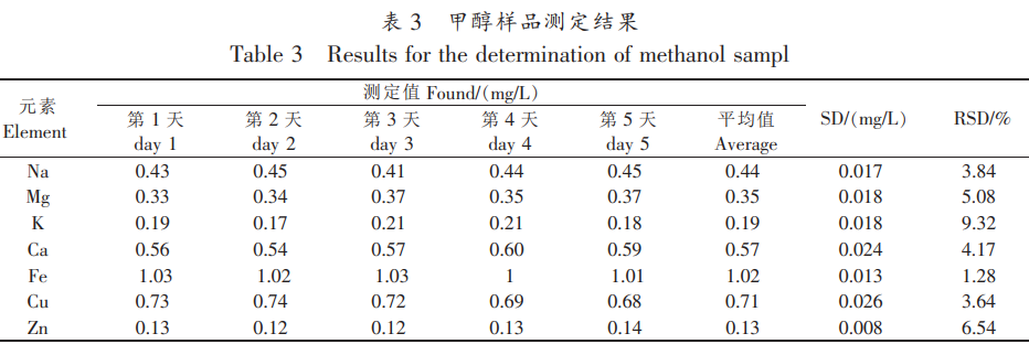 甲醇蒸干過程中可能會損失一部分金屬離子,影響方法準確度。對于這一問題,可以采用加標回收試驗來進行驗證,結(jié)果見表4。試驗證明,各元素的加標回收率都大于95.0%,蒸發(fā)過程中各元素的損失極小,甲醇蒸干方式及其他試驗條件選擇正確,分析結(jié)果準確。