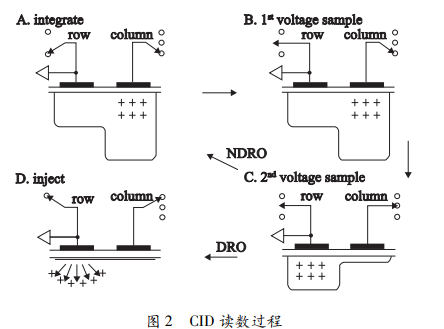 一個(gè)單獨(dú)的CID檢測(cè)單元包括兩個(gè)導(dǎo)電性的電極和引線,放置在一個(gè)很薄的硅氧化物或氮化物絕緣層上,即橫向電極(rowelectrode)和縱向電極(columnelectrode),在橫向電極上有一個(gè)讀數(shù)放大器,兩個(gè)電極之間加以偏壓,開始積分時(shí),首先在橫向電極上加以很小的正電壓,而在縱向電極上加以很小的負(fù)電壓,光照在檢測(cè)器表面時(shí),產(chǎn)生的正電荷向縱向電極上聚集,當(dāng)?shù)谝淮巫x數(shù)時(shí),將橫向電極上的正電壓去掉,同時(shí)將縱向電極上的電壓轉(zhuǎn)為小的正電壓,電荷從縱向電極上轉(zhuǎn)移到橫向電極上(圖2中B到C),即可讀出在橫向電極上聚集的電荷所產(chǎn)生的電壓,此為第一次讀數(shù)。又經(jīng)過(guò)一段積分后,將縱向電極上加以負(fù)電壓,橫向電極上加以正電壓,此時(shí)電荷從橫向電極轉(zhuǎn)移到縱向電極,此時(shí)又可讀出橫向電極上的電壓變化,即第二次讀數(shù)(圖2中C到A);然后再在橫向電極上加以負(fù)電壓,縱向電極上加以正電壓,使電荷再轉(zhuǎn)移回到橫向電極,并重復(fù)第一次讀數(shù)的過(guò)程,當(dāng)全部積分結(jié)束,進(jìn)行最后一次讀數(shù)時(shí),在兩個(gè)電極上同時(shí)加以正電壓,使電荷注入CID基體,此時(shí)讀出橫向電極上電壓的變化即為最后一次讀數(shù)的結(jié)果,此過(guò)程如圖2所示。