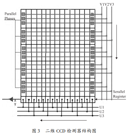 為了從電荷產(chǎn)生的檢測(cè)單元將電荷轉(zhuǎn)移到讀出電極,需將電荷從一個(gè)檢測(cè)單元轉(zhuǎn)移到其相鄰的一個(gè)檢測(cè)單元,然后再往下轉(zhuǎn)移,直到被讀出,要實(shí)現(xiàn)這一目的,每一個(gè)檢測(cè)單元內(nèi)的電場(chǎng)必須分成三個(gè)獨(dú)立的區(qū)域,通過(guò)控制這三個(gè)區(qū)域的電場(chǎng)變化來(lái)將電荷進(jìn)行移動(dòng)。在這三個(gè)電極中至少有一個(gè)的電場(chǎng)是反相的,用于設(shè)置一個(gè)隔離區(qū)以分開其他檢測(cè)單元的電子,然后通過(guò)移動(dòng)這個(gè)隔離帶的位置使電荷遷移。二維CCD檢測(cè)器結(jié)構(gòu)如圖3所示。