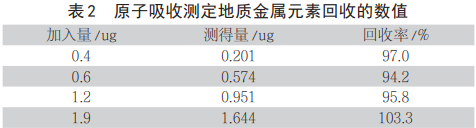 首先,樣品處理,通常情況下,在進(jìn)行礦山地質(zhì)實(shí)驗(yàn)測試時(shí),需要將樣品磨細(xì)并放置于反應(yīng)瓶中,隨后加入一定量硝酸,利用加熱裝置進(jìn)行加熱,在樣品消解過程中,要采用高溫消解法對(duì)其進(jìn)行消解;待到酸完全被消耗掉后,加入一定量高氯酸,并用玻璃棒進(jìn)行攪拌,當(dāng)高氯酸完全溶解之后,再將其轉(zhuǎn)移到反應(yīng)瓶中;最后,利用滴定管進(jìn)行滴定,待到溶液顏色變?yōu)榛野咨珪r(shí)停止滴定。在進(jìn)行分析時(shí),要選擇合適測定波長。通常情況下,對(duì)于大部分元素來說,不同的元素有不同的特征譜線,原子吸收光譜的波長范圍是190nm~800nm,要嚴(yán)格按照既定方法對(duì)標(biāo)準(zhǔn)物質(zhì)進(jìn)行測定。通常情況下,標(biāo)準(zhǔn)物質(zhì)測定應(yīng)控制在0.1mg/mL以內(nèi),而在采用原子吸收法進(jìn)行測定時(shí),所采用標(biāo)準(zhǔn)物質(zhì)需要滿足以下幾點(diǎn)要求:①標(biāo)準(zhǔn)物質(zhì)為已知質(zhì)量分?jǐn)?shù)純物,而在進(jìn)行測量時(shí),需要確保樣品質(zhì)量分?jǐn)?shù)為99.8%;②標(biāo)準(zhǔn)物質(zhì)具有規(guī)定技術(shù)性能,而在進(jìn)行測量時(shí),所采用技術(shù)性能保證在規(guī)定范圍內(nèi);③標(biāo)準(zhǔn)物質(zhì)要有代表性,要保證樣品中各個(gè)元素含量都能達(dá)到檢測標(biāo)準(zhǔn);④標(biāo)準(zhǔn)物質(zhì)中不能含有其他雜質(zhì)元素,以避免對(duì)測定結(jié)果造成影響;⑤標(biāo)準(zhǔn)物質(zhì)是具有代表性純物,而在進(jìn)行測定時(shí),所采用樣品要具有代表性;⑥標(biāo)準(zhǔn)物質(zhì)在進(jìn)行測定時(shí)不能產(chǎn)生明顯干擾,以避免影響檢測結(jié)果,如表2。
