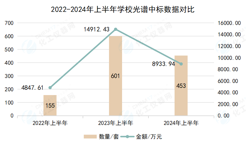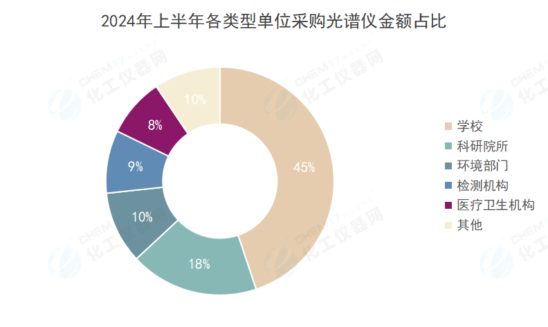據(jù)統(tǒng)計的數(shù)據(jù),包括高校、職業(yè)院校和中學(xué)在內(nèi)的學(xué)校系統(tǒng)仍然牢牢占據(jù)光譜儀政府采購的主力地位。按照中標(biāo)數(shù)據(jù)統(tǒng)計,2024年上半年學(xué)校共采購光譜儀453套,占總數(shù)量的60.2%;采購金額為8933.94萬元,占總金額的44.9%。