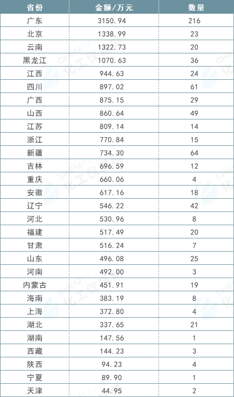 據(jù)統(tǒng)計,2024年上半年光譜儀政府采購的單位分布在全國29個省份。華東地區(qū)是最大的市場,采購金額共4,528.14萬元,約占總金額的22.7%;采購數(shù)量120套,約占總數(shù)量的15.9%。其次是華南地區(qū),其中廣東采購金額為3150.94萬元;約占總金額的15.8%;共采購216套,約占總數(shù)量的28.7%。