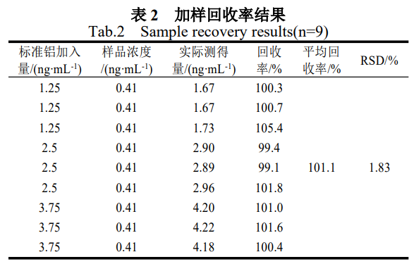 精密量取供試品1.0mL(企業(yè):Ab1,批號:1E200106)至15mL聚乙烯管中,加入內(nèi)標(biāo)溶液1mL,分別精密加入鋁儲備溶液(50ng·mL-1)0.25、0.5、0.75mL各3份,用水稀釋到10mL刻度處?;厥章式Y(jié)果見表2。