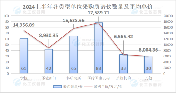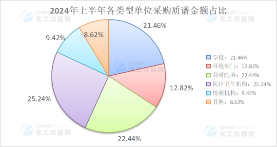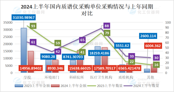 從“2024上半年國(guó)內(nèi)質(zhì)譜儀采購(gòu)單位采購(gòu)情況與上年同期對(duì)比”來(lái)看,上半年,醫(yī)療衛(wèi)生機(jī)構(gòu)取代學(xué)校成為采購(gòu)主力;與此同時(shí),學(xué)校采購(gòu)數(shù)據(jù)的變化幅度也最大。上半年醫(yī)療衛(wèi)生機(jī)構(gòu)采購(gòu)質(zhì)譜儀數(shù)量88套與上年同期的79套相比,同比增長(zhǎng)了約11.39%;采購(gòu)金額1.76億元與上年同期的1.83億元相比,同比下降了約3.67%。