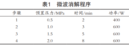雞樅菌樣品微波消解前處理方法為:稱取0.5g樣品,精密稱定,置于消解罐中,分別加入5mL濃硝酸、2mL過氧化氫,放置在110℃恒溫加熱臺預(yù)消解15min,補(bǔ)加2mL濃硝酸、1mL過氧化氫,消解罐加蓋后放入微波消解儀中按表1程序進(jìn)行消解。