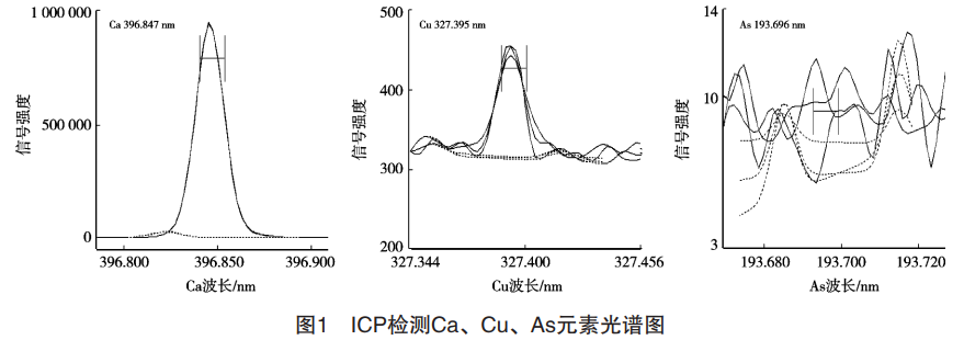 用程序?qū)﹄u樅菌樣品溶液進(jìn)行分析,可以得到69種元素測試結(jié)果的光譜輪廓描記圖、信背比及相對標(biāo)準(zhǔn)偏差(RSD)等參數(shù)。從光譜輪廓描記圖可以直觀地觀察到每種元素響應(yīng)信號情況,含量高的元素信號強(qiáng),含量低的信號弱,而那些信號淹沒在基線背景中的元素可認(rèn)為不存在或利用該法無法檢測。以鈣、銅、砷3種元素為例,ICP檢測雞樅菌樣品中這3種元素的發(fā)射光譜圖如圖1所示(圖中S值表示信號強(qiáng)度,B值表示背景強(qiáng)度)。雞樅菌樣品中,鈣元素信號響應(yīng)很強(qiáng),銅元素次之,而砷元素信號完全淹沒在背景之中,因此可以定性雞樅菌中存在鈣和銅元素,而砷元素在ICP-OES法檢測限以下,無法定性。另外,利用ICP操作系統(tǒng)檢測時給出的RSD數(shù)據(jù),也可判斷是否能夠檢測某種元素。如檢測3種元素的RSD值分別為:鈣0.80%、銅6.59%和砷749%。利用該法可以鑒定鈣元素、銅元素,對于砷元素則無法鑒定。
