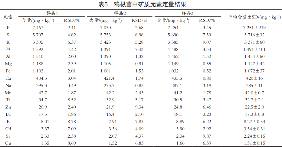 按1.4定性分析方法,確定雞樅菌中含17種礦質(zhì)元素,分別為P、S、K、Si、Al、Mg、Fe、Ca、Na、Mn、Ti、Zn、Ba、B、Cd、Sr、Cu。對于這17種元素進(jìn)行定量分析。