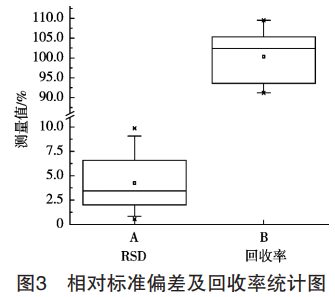 關(guān)于測定結(jié)果的精密度和準(zhǔn)確度,51個RSD測定結(jié)果和9個元素回收率測定結(jié)果統(tǒng)計分析見圖3。在51個測定結(jié)果的RSD值中,小于2%的有13個,2%~5%的有20個,5%~10%的有18個,回收率測定結(jié)果都在100%±10%以內(nèi)。