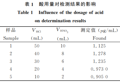 用10~50mL鹽酸、2~10mL硝酸進(jìn)行溶樣試驗(yàn),結(jié)果見表1。由表1可知,加入酸過少,樣品溶解不完全,導(dǎo)致檢測(cè)結(jié)果偏低;加入酸過多,樣品處理時(shí)間將增加,導(dǎo)致銦在高溫下部分揮發(fā),使檢測(cè)結(jié)果偏低;最佳酸用量為40mL鹽酸+8mL硝酸。故實(shí)驗(yàn)選擇酸用量為40mL鹽酸+8mL硝酸。