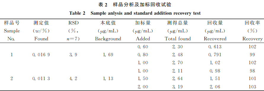 應(yīng)用本方法測(cè)定不同廠家高爐塵中的銦,并在樣品中加入適量銦標(biāo)準(zhǔn)工作溶液進(jìn)行加標(biāo)回收試驗(yàn),結(jié)果見表2。