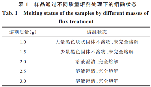 從表1可以看出,當(dāng)熔劑質(zhì)量達(dá)到2.0g時(shí),樣品熔解效果比較完全,沒有黑色不溶物出現(xiàn)。因此,本文選擇熔劑用量為2.0g,既能減少熔劑加入又可以將樣品熔解完全,節(jié)能減排的同時(shí)防止因加入過多的熔劑使待測(cè)溶液鹽分過高、霧化器的堵塞、霧化的效率、儀器靈敏度的降低以及損害鎳坩堝。