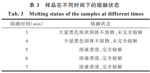 通過表3可以清晰地看出,低于5min的熔融時(shí)間不會(huì)讓樣品熔解完全,而過高的時(shí)間會(huì)造成經(jīng)濟(jì)的浪費(fèi),因此5min為最適宜熔融時(shí)間。
