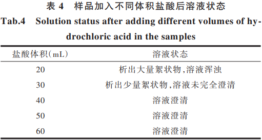 表4結(jié)果表明,當(dāng)加入鹽酸量為30mL時(shí),仍然會(huì)析出少量絮狀物;當(dāng)酸用量增加至50mL,溶液逐漸清亮,但加入酸量過高,酸度過大;用40mL鹽酸酸化時(shí),溶液不僅清亮,且加入酸量較少。綜合考慮,緩慢加入40mL鹽酸進(jìn)行酸化處理。