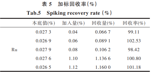 通過對(duì)上述標(biāo)準(zhǔn)溶液的檢測(cè),繪制出釕的特定校準(zhǔn)曲線。其中,該曲線橫坐標(biāo)為釕的質(zhì)量濃度,縱坐標(biāo)為光譜強(qiáng)度。當(dāng)釕的質(zhì)量濃度在0.00~5.00mg/L范圍內(nèi)時(shí),其質(zhì)量濃度與發(fā)射強(qiáng)度呈線性關(guān)系,線性方程為y=115.50x+3.176,具體相關(guān)系數(shù)為0.999。通過測(cè)定,獲得檢出限為0.019mg/L,定量限為0.0650mg/L。因此,本文針對(duì)釕的檢測(cè)方法滿足檢出限要求。