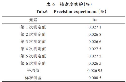 按照實(shí)驗(yàn)方法對(duì)試樣平行測(cè)定6次,通過6次檢測(cè)結(jié)果計(jì)算本次實(shí)驗(yàn)的標(biāo)準(zhǔn)偏差。結(jié)果如表6所示,可以清晰發(fā)現(xiàn),6次測(cè)定值之間差距不大,標(biāo)準(zhǔn)偏差僅為0.0005%,該方法精密度較高。