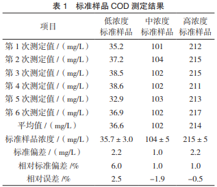 按照樣品分析步驟分別測定低、中、高3種不同濃度的COD標(biāo)準(zhǔn)樣品,各進(jìn)行6次重復(fù)性測定,測定結(jié)果如表1所示。從表1可以看出,3種濃度標(biāo)準(zhǔn)樣品的測定結(jié)果在保證值范圍內(nèi),相對誤差為-1.9%~2.5%,表明該方法測定水質(zhì)COD具有良好的正確度,能夠滿足試驗(yàn)要求。