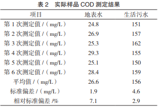 按照樣品分析步驟分別測定低、中、高3種不同濃度的COD標(biāo)準(zhǔn)樣品以及地表水、生活污水兩種實(shí)際樣品。每個樣品進(jìn)行6次重復(fù)性測定[5],計(jì)算平均值、標(biāo)準(zhǔn)偏差和相對標(biāo)準(zhǔn)偏差,測定結(jié)果如表1和表2所示。從表1可以看出,標(biāo)準(zhǔn)樣品COD測定結(jié)果的相對標(biāo)準(zhǔn)偏差介于1.0%~6.0%。從表2可以看出,實(shí)際樣品COD測定結(jié)果的相對標(biāo)準(zhǔn)偏差介于2.9%~7.1%。由表1、表2可知,快速消解分光光度法測定水質(zhì)COD的相對標(biāo)準(zhǔn)偏差為1.0%~7.1%,說明該方法具有良好的精密度,能夠滿足試驗(yàn)要求。