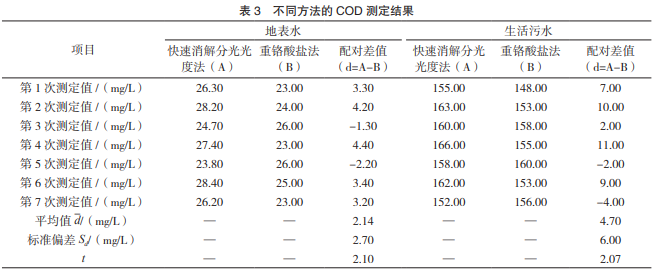 目前,我國COD測定應(yīng)用最廣泛的方法是重鉻酸鹽法,選擇該方法作為快速消解分光光度法的對比方法。方法比對采用的實(shí)際樣品類型包括地表水和生活污水。每類樣品采集7個濃度水平接近的樣品,分別采用快速消解分光光度法和重鉻酸鹽法進(jìn)行測定,獲得7組配對測定數(shù)據(jù),對兩種方法的測定結(jié)果進(jìn)行t檢驗(yàn)[5-6],檢驗(yàn)結(jié)果如表3所示。