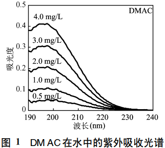 DMAC和硝酸鹽在水中的紫外吸收光譜如圖1、圖2所示??梢钥闯?DMAC在190~210nm范圍內(nèi)有很強的紫外吸收?各濃度下DMAC的最大吸收波長均196.0nm左右1.5nm范圍內(nèi)與曹金鵬等人的研究結(jié)果相一致。硝酸鹽在190~210nm范圍內(nèi)也具有很強的紫外吸收在201.0nm處有吸收峰?峰形較DMAC寬。將DMAC和硝酸鹽的紫外吸收光譜放在一張圖中(圖3)可以清楚地看到硝酸鹽與DMAC的吸收峰相近吸收光譜存在明顯的重疊因此硝酸鹽的存在將對水中DMAC的紫外分光光度法測定產(chǎn)生明顯影響。