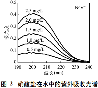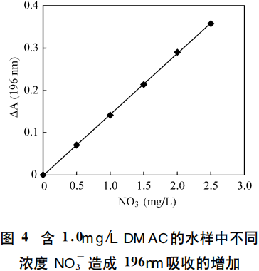 當(dāng)水中DMAC濃度為1.0mg/L時不同硝酸鹽濃度導(dǎo)致196.0nm處吸光度上升的情況如圖4所示。可以看出硝酸鹽濃度在2.5mg/L以內(nèi)即可使水樣吸光度大幅提高。在DMAC濃度為1mg/L的情況下以196.0nm處的吸光度對DMAC進行定量分析要使測量DMAC誤差在5%以內(nèi)必須使硝酸鹽濃度小于0.046mg/L。因此水樣中少量硝酸鹽的存在即會對DMAC測量結(jié)果產(chǎn)生顯著影響。