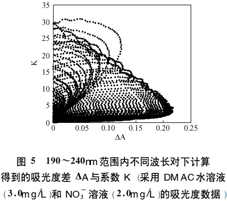 參照吳家齊等人的方法?用MatLab軟件編寫波長對選擇程序?然后在190~240nm之間每隔0.5nm測定DMAC溶液(3.0mg/L)和NO-3溶液(2.0mg/L)的吸光度?將202個吸光度數(shù)據(jù)輸入波長對選擇程序?計算得到1012-101=10100個波長對所對應(yīng)的K值和吸光度差ΔA?其分布如圖5所示??梢钥闯?對于3.0mg/L的DMAC溶液?其吸光度差ΔA最大可達(dá)0.217?但該處對應(yīng)的K值為4.3左右較大可能導(dǎo)致ΔA測量值的不穩(wěn)定。綜合考慮方法的靈敏度和穩(wěn)定性?最終選擇DMAC的測定波長選擇194nm和219nm(ΔA=0.2065?K=2.171)。
