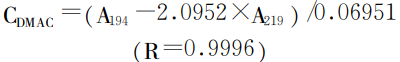 根據(jù)倪永年等人的研究結(jié)果當(dāng)兩種物質(zhì)在溶液中的吸光度加和性較差時采用傳統(tǒng)的K系數(shù)確定方法(根據(jù)純干擾組分在測定波長處的吸光度求得)會出現(xiàn)較大的誤差。在DMAC與NO-3的混合體系中盡管在某些濃度組合中DMAC與NO-3的吸光度加和較好但在部分濃度組合的某些波長處?吸光度加和性不佳因此為獲得更加準(zhǔn)確的結(jié)果本文參考倪永年等人提出的方法測定K系數(shù):配制7組不同濃度比的DMAC和NO-3混合液(8∶1、3∶1、4∶3、1∶1、1∶2和1∶5)?擬合得到K=2.0952獲得DMAC的標(biāo)準(zhǔn)曲線: