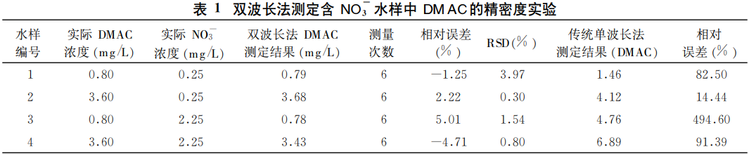 在硝酸鹽濃度為0.25mg/L和2.25mg/L DMAC為0.8mg/L和3.6mg/L的條件下?連續(xù)測定6次考察測定方法的精密度結(jié)果如表1所示??梢钥闯鰧τ谒姆N不同濃度組合的DMAC、硝酸鹽混合溶液DMAC測量的相對誤差在±5%以內(nèi)相對標(biāo)準(zhǔn)偏差也在4%以內(nèi)。而傳統(tǒng)單波長法測定四種溶液的相對誤差為14%~495%??梢婋p波長法測定DMAC的精密度較高可顯著降低硝酸鹽對DMAC測定的影響。