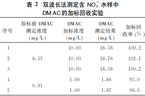 作者所在實驗室處理DMAC廢水的兩個反應(yīng)器出水中分別含DMAC8.55、0.91mg/L分別含NO-3110.9、10.1mg/L向兩個反應(yīng)器出水中分別加標(biāo)DMAC10.00、1.00mg/L結(jié)果如表2所示??梢钥闯?span>DMAC的加標(biāo)回收率為95.0%~102.2%本方法的準(zhǔn)確度較高。