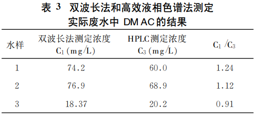 對某化纖廠三種不同廢水(車間排水、調(diào)節(jié)池出水、二沉池出水)中的DMAC含量分別采用高效液相色譜法和雙波長法測定?結(jié)果如表3所示??梢钥闯鲭p波長法同高效液相色譜法具有相近的測定結(jié)果?同時由于分光光度計為常規(guī)分析儀器因此本方法非常適合于該類廢水中DMAC的快速測定。兩種測定方法的偏差在一定程度上反映了廢水中其他紫外吸收物質(zhì)對DMAC測定的影響。