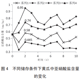 將不同貯存條件下小白菜、土豆、黃瓜、白蘿卜中亞硝酸鹽含量變化繪制成圖(見圖2~5),圖中系列1、2、3、4代表不同貯存條件下含量變化曲線,分別是5℃+敞開、5℃+密封、25℃+敞開、25℃+密封。