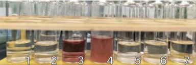 由圖1可知,乙腈(3號管)和乙腈水溶液(4號管)提取能力過強,很容易把樣品中各種色素提取出來。因分光光度法中,顏色的變化與濃度相關,可以直觀地反映出多酚的濃度水平。超強的提取力會干擾分光的測試結果,因此不適合作為本試驗的萃取溶劑。通過對剩下5種提取液顯色結果測試發(fā)現(xiàn),丙酮(7號管)做試劑空白時,顯色顏色與多酚目標物一致,吸光值很大,干擾測試結果。