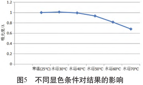 從圖5中可看出:在溫度范圍為25℃到40℃范圍內,隨著顯色溫度的升高,相同含量的溶液其吸光度無明顯差異,當溫度高于40℃時,隨著溫度逐漸升高,吸光度相應降低;說明溫度升高,不利于反應體系的穩(wěn)定。因此,本方法最終選擇常溫(約25℃)作為顯色條件。