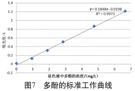 分別移取1mL中間工作液于離心管中,加入0.25mL的福林酚,搖勻反應3min,再加2.5mL的碳酸鈉溶液,然后用水定容,此時顯色液中多酚的濃度分別為0mg/L、0.95mg/L、1.90mg/L、2.85mg/L、4.75mg/L、6.65mg/L,分光光度法測試其吸光度,用線性對濃度和對應的吸光度進行線性擬合,其R2為0.9973,大于0.99,說明方法的線性良好。結果見圖7。