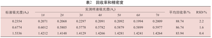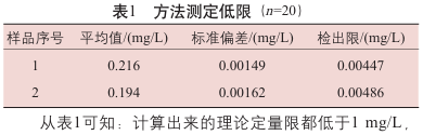 取2個空白樣品,按照優(yōu)化的試驗條件進行處理,并對空白樣品進行20次測定后,按照標準方程的適用范圍評估檢出限和定量限,檢出限(LOD)可按LOD=3×標準偏差,檢出限結果見表1。