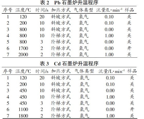 Pb元素空心陰極燈工作電流6mA,特征波長(zhǎng)283.3 nm,狹縫寬0.7 nm,點(diǎn)燈方式為BGC-D2,載氣 為氬氣。選擇10g/L磷酸二氫銨作為基體改進(jìn)劑。